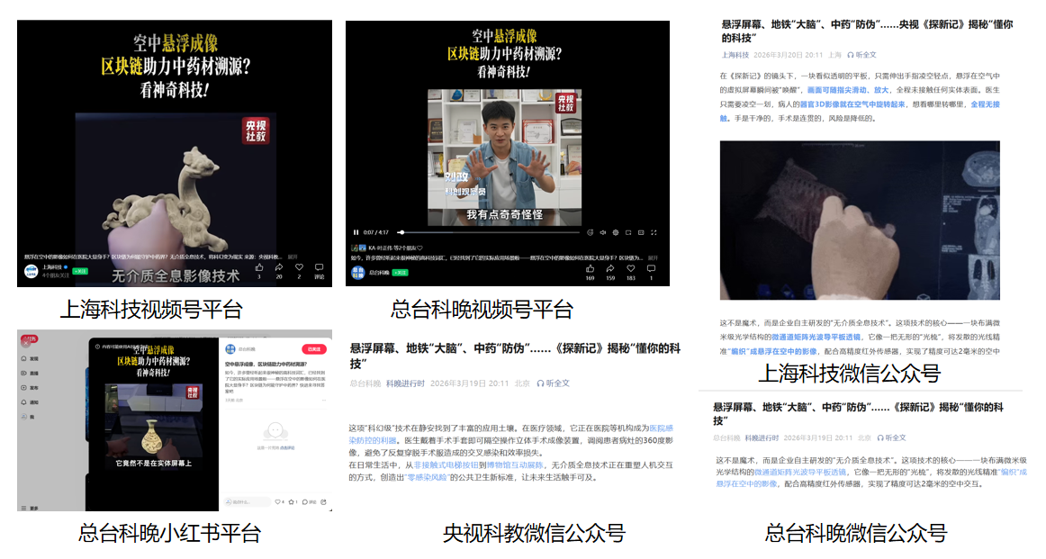 Recently, CCTV's Tan Xin Ji Season 2 went behind the scenes at cutting-edge technology sites in Shanghai, showcasing the innovative achievements of "new quality productive forces" across official media platforms such as CCTV Science and Technology Gala, CCTV Social Education, CCTV Science and Education, and Shanghai Science and Technology. Among them, XHOLO, as a representative high-tech enterprise in the Shibei High-Tech Park, made a stunning appearance with its Media-free Holography technology, presenting cutting-edge explorations in the field of aerial imaging to the industry.